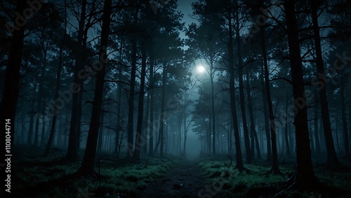 Mysterious and magical moonlit forest in twilight.