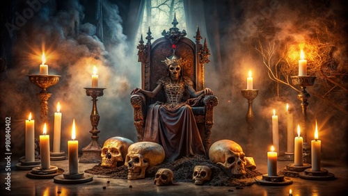 Mysterious dark altar with candles, skulls, and eerie artifacts surrounds a vacant throne, evoking the aura of a powerful African American voodoo queen.