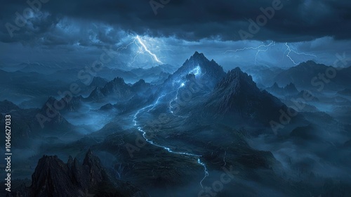 Mysterious dark mountains illuminated by lightning in a stormy sky.