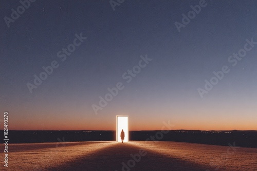 doorway, twilight, landscape, mysterious, glowing, solitude, horizon, light, adventure, exploration, surreal, entrance, journey, immensity, colours, scene, night, transition, minimalism, imagination, aethereal, symbolism, perspective, dreamlike, nature, open, path, stillness, wonder, possibility, escape, visual, calmness, beauty, serenity, dusk, ambient, isolated, illumination, contour, shape, environment, sky, silhouette, image