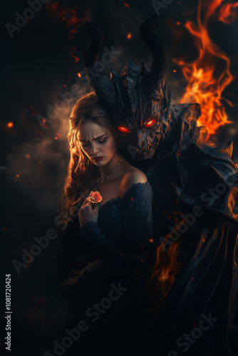 dark, figure, mysterious, encounter, woman, blue, dress, rose, fiery, landscape, twilight, fearsome, illustration, glowing, eye, dramatic, atmosphere, fantasy, art, supernatural, contrasting, emotion, mystical, enchanting, gothic, mythical, character, visual, storytelling, emotion, intensity, danger, beauty, fire, darkness, creativity, imagination, portrait, intrigue, romance, tension, horror, folklore, girl, monster