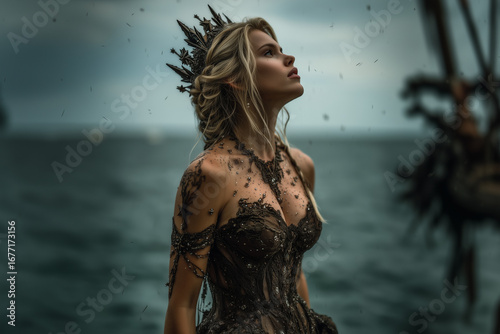 fantasy, queen, ocean, gothic, crown, dress, woman, sea, mystical, dark, moody, dramatic, beauty, mysterious, elegant, fashion, model, regal, mythical, royals, enchantress, nature, wave, costume, fierce, powerful, majestic, artistic, cinematic, aethereal, underwater, magic, character, stormy, surreal, creative, alternative, fairy tale, warrior, goddess, princess, storytelling, emotion, portrait