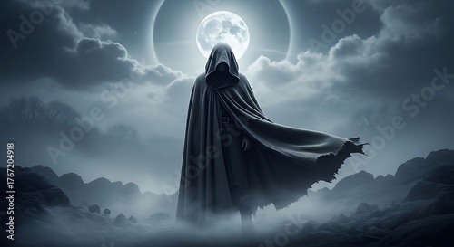 mystery, shadow, moonlight, cloaked, figure, darkness, silhouette, night, aethereal, hooded, ominous, supernatural, fantasy, gothic, eerie, skittish, moon, cloud, horror, grim, reaper, death, fate, destiny, sorcerer, magician, magic, occult, ritual, cult, secret, hidden, unknown, veil, shroud, apparition, specter, ghost, phantom, spooked, spirit, soul, afterlife, beyond, dream, nightmare, fear, anxiety
