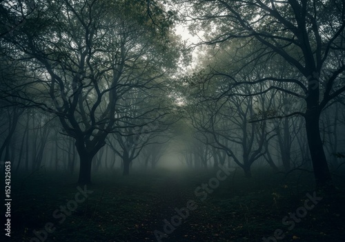 Mysterious Foggy Forest Path - A dark, atmospheric of a path winding through a dense forest shrouded in thick fog, creating a sense of mystery and intrigue