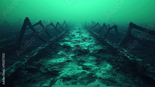 fog, landscape, eerie, structure, road, mist, dark, green, surreal, atmospheric, depth, terrain, nature, isolation, ambience, shadow, clarity, gloom, adventure, exploration, trekking, journey, mysterious, environment, scenery, wild, natural, wilderness, calm, tranquil, meditative, peculiar, stillness, unknown, horizon, visual, abstract, photo, minimalism, texture, shape, line, pathway, stone, water, composition, dreamlike