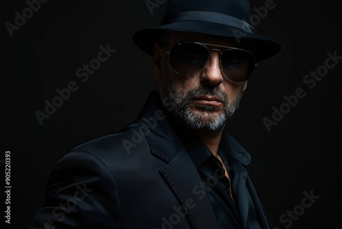 man, hat, sunglasses, beard, dark, background, posing, mystery, confidence, sophistication, apparel, stylish, portrait, serious, attire, expression, fashion, shadow, dramatic, face, cool, gaze, male, adult, elegant, enigmatic, mood, urban, character, personality, vibe, night, secretive, trendy, chic, charisma, modern, strong, bold, presence