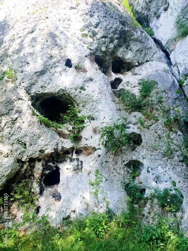 Mysterious mountain bird nests in the rocks on the hill