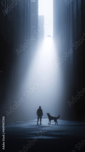 Mysterious night alley: solitary figure and dog silhouetted in misty light beam