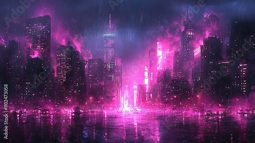 Mysterious Night City: Dark Street, Neon Lights, and Smoky Atmosphere