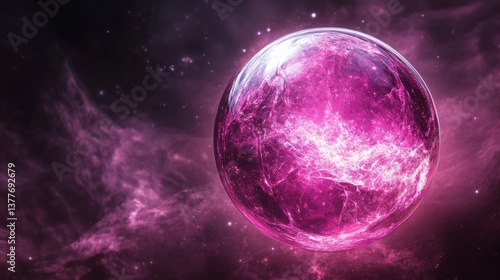 Mysterious pink nebula planet in space with glowing aura and stars