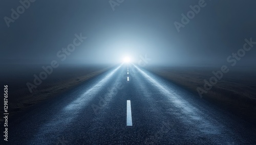 Mysterious Road Ahead with Fog and Bright Light Creating an Eerie Atmosphere of Unknown Journey and Adventure