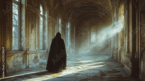 robe, cloak, character, silhouette, corridor, architecture, ancient, ruin, mystery, light, darkness, atmosphere, gothic, loneliness, walking