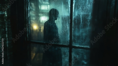 Mysterious Silhouette of a Person Standing Behind a Rain-Soaked Window in an Urban Night Setting