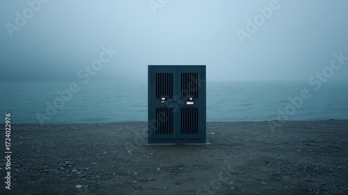 fog, water, structure, isolation, calm, mystery, landscape, calmness, nature, quiet, blue, serene, environment, empty, shore, mist, stillness, building, coastal, evening, solitude, horizon, simple, design, adventure, exploration, minimalism, atmospheric, dreamlike, tranquil, coast, foggy, sky, aesthetic, dark, lake, peaceful, scenery, calmness, remote, visual, ground, wilderness