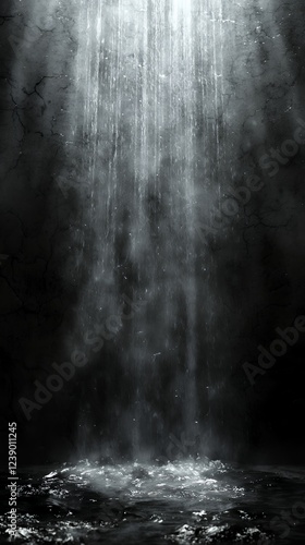 waterfall, water, cascade, dark, black, white, monochrome, grey, shadow, light, texture, rock, stone, wall, surface, liquid, flow, movement, stillness, contrast, mystery, dramatic, moody, obscure, enigmatic, serene, calm, peaceful, ambient, atmosphere, nature, photo, image, abstract, artistic, visual, composition, style, design, background