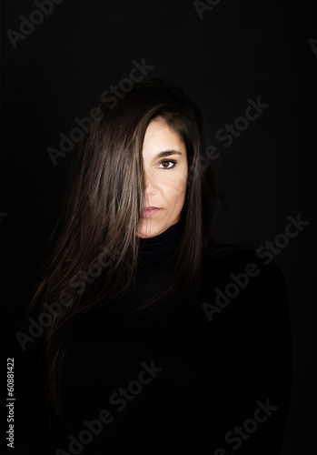 anonymous, beautiful, black, black background, caucasian, dark, elegance, emotion, face, fashion, femininity, girl, intense, light, model, mysterious, person, portrait, portraiture, posing, pretty, seduction, seductive, sensual, sensuality, serious, sexy, studio, woman