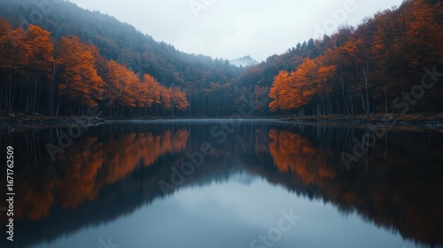 Mystic lake mirroring vibrant autumn forest, a tranquil scene of nature's embrace