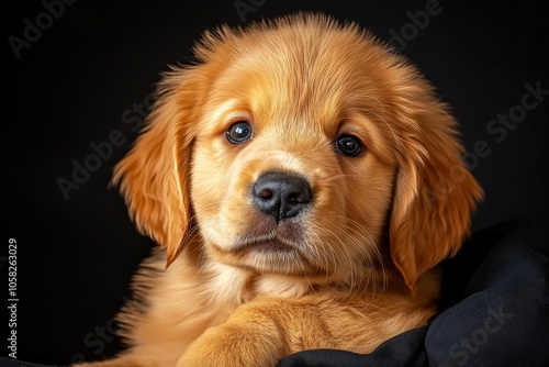 Mystic portrait of baby Golden Retriever in studio, copy space on right side, Headshot, Close-up View, isolated on black background