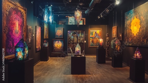 mystical art gallery featuring fantasy-inspired paintings, glowing crystals, and mythical sculptures