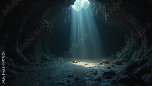 Mystical cave, beam light shines through ceiling. Sunlight illuminates small area, stones on the ground. Dramatic, dark atmosphere. Adventure, fantasy, myth, journey, exploration, legend.
