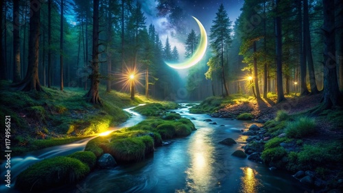 crescent moon, night photography, magical, mystical, enchanting, tranquil, glowing, moonlit, aethereal, fantasy, nature, landscape, star, moonlight, dark, serene, peaceful, calm, water reflection, forest, wood, tree, river, night, fairy tale, night sky, aerial photography, night scene