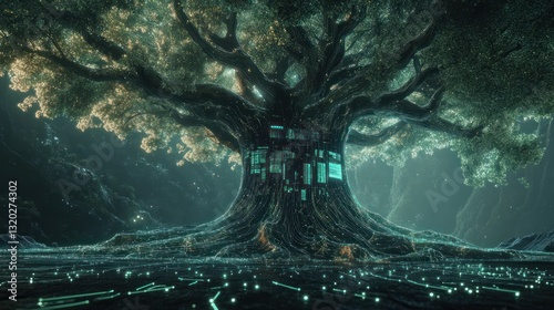 tree, ancient, digital, futuristic, glowing, mystical, tech, nature, forest, light, root, technology, modern, design, fantasy, art, artwork, illustration, three-dimensional, render, science fiction, environment, landscape, illuminated, abstract, energy, magic, branch, leaf, datum, circuit, node, connection, web, future, digital artwork, innovation, imagination, virtual, reality, system, network, power, giant, wisdom