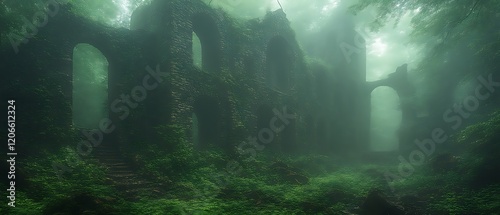 ruin, fog, mystical, overgrown, forest, stone, ancient, architecture, mystery, abandoned, moss, green, tree, nature, atmosphere, dark, skittish, fantasy, magical, aethereal, mysterious, old, history, path, step, wall, arch, vegetation, hidden, secret, enigmatic, wild, timeless, serene, peaceful