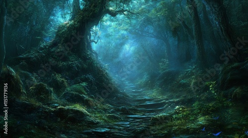 forest, path, tree, ancient, mystical, magical, enchanted, wood, pathway, trail, journey, adventure, mysterious, dark, shadowy, deep, green, lush, foliage, moss, rock, stone, step, stair, fog, mist, aethereal, dreamlike, serene, peaceful, calm, quiet, solitude, nature, wilderness, calmness, beauty, light, blue, twilight, fantasy, surreal