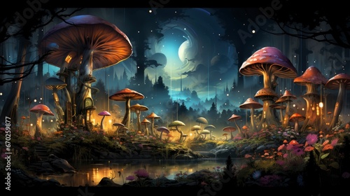 Mystical forest scene with illuminated mushrooms, magical castle, glowing lights, and serene pond reflections.