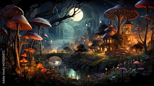 Mystical forest scene with illuminated mushrooms, magical castle, glowing lights, and serene pond reflections.