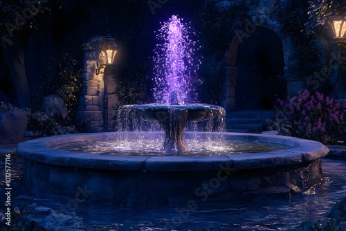fountain, garden, night, water, stone, purple, blue, dark, magic, fantasy, illuminated, sparkling, tranquil, serene, dreamy, mystical, enchanting, magical, peaceful, calm, stillness, architecture, classic, old, ancient, romantic, elegant, lush, greenery, foliage, flower, light, lamp, glow, shadow, artwork, digital, render, three-dimensional, realistic, art