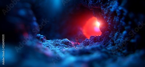 Mystical grotto illuminated with ethereal blue and radiant crimson light