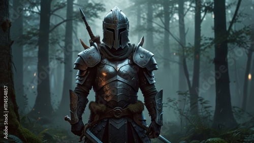 Mystical knight in dark forest.