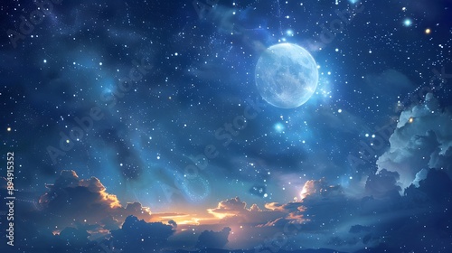 Mystical sky with glowing, fantastical constellations and a radiant, ethereal moon