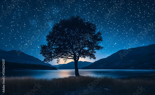 tree, night, sky, star, landscape, water, lake, mountain, silhouette, twilight, grass, scenic, nature, dark, serene, tranquil, moonlight, cosmos, galaxy, astronomy, celestial, peaceful, quiet, beauty, starlight, evening, dreamy, aethereal, mystic, atmospheric, environment, hillside, riverside, scenery, timberland, nobody, horizon, outdoors, panorama, immensity, universe, vista, calm, pristine