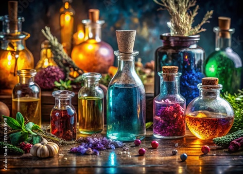 Mystical Witchcraft Potion Bottles & Herbs - Dark Fantasy Product Photography