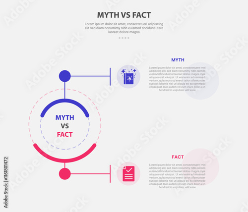 myth vs facts infographic outline style with 2 point comparison template with creative circle line connection top and bottom for slide presentation