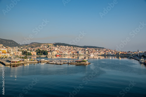 Mytilene port early in the morning as seen from the boat, in the island of Lesvos, Greece