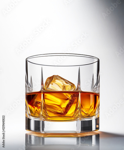 n the photo, Scotch whisky (Scotch) in a classic glass with ice. The drink is dark golden in color, placed on a textured wooden table. The background is blurred