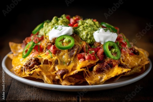 Nachos mit Käse Guacamole Jalapenos Sour Cream Tex Mex Snack Partyfood überbackene Nachos mexikanisches Essen Fingerfood würzige Chips Toppings Streetfood Foodfotografie Fastfood Genuss
