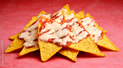 Nachos with cheese and salsa on red background, chips, mexican food, appetizer, snack, restaurant