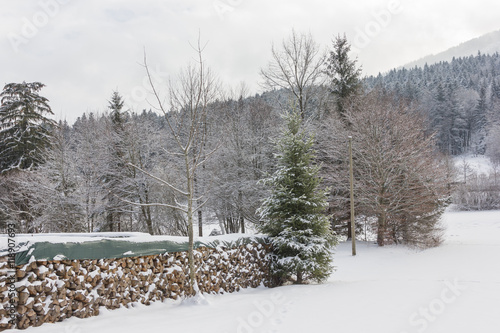Nachwachsende Rohstoffe, Holz, Holzlager im Schnee