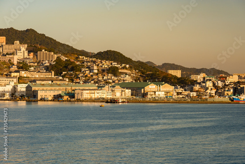 Nagasaki Bay, Nagasaki, Japan on a clear early morning with golden light