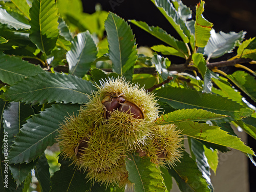 Nahaufnahme von Maronen, den Früchten der Edelkastanie, Castanea sativa