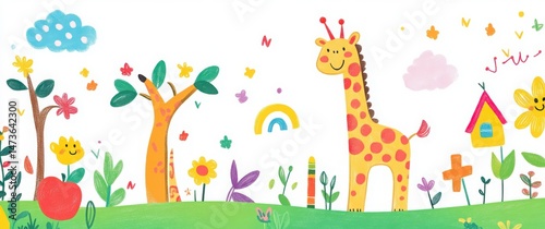 Naive children's chalk drawing of a giraffe with numbers, letters, rainbow, animals, and nature elements on a white background. Cute crayon-style doodle with pastel colors