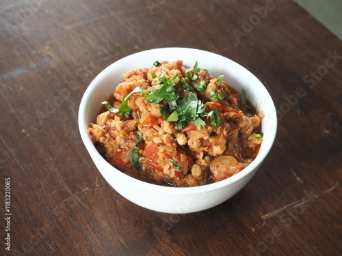 nam, food, thai, dip, north, northern, pork meat, tomatoes, chili, hot, spicey, minced, paste, red, coriander, cilantro, spice, condiment, curry, relish