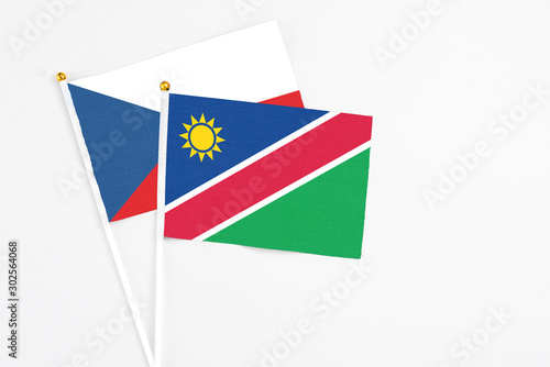 Namibia and Cyprus stick flags on white background. High quality fabric, miniature national flag. Peaceful global concept.White floor for copy space.
