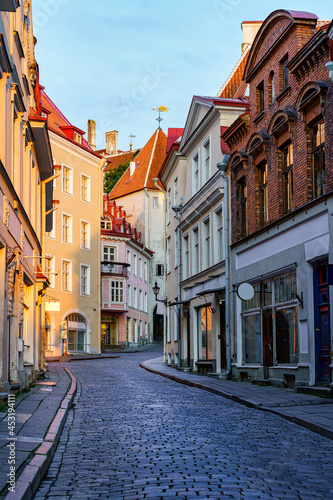 Narrow alley of medieval houses in the city of Tallinn at sunrise. Estonia.
