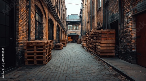alley, brick, building, city, industrial, pallet, street, urban, architecture, background, brown, cargo, concrete, construction, dark, delivery, design, exterior, factory, grunge, lane, logistic, old, path, pavement, perspective, place, road, rust-eaten, shipping, space, stone, texture, transportation, vintage, wall, warehouse, way