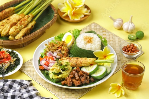 white rice, lunch, savoury, epicure, vegetable salad, vegetable, side dish, bali, grilled chicken, peanut, cooking, satay, indonesian, lemongrass, eatery, asian, cookery, spicey, rice, delicious, dinner, indonesia, food, meal, traditional, balinese, main course, dish, background, culture, healthy, meat, banana leaf, fresh, colourful